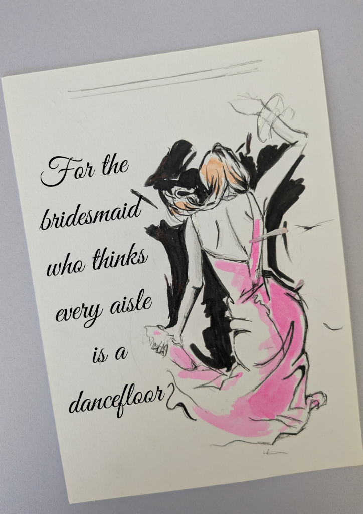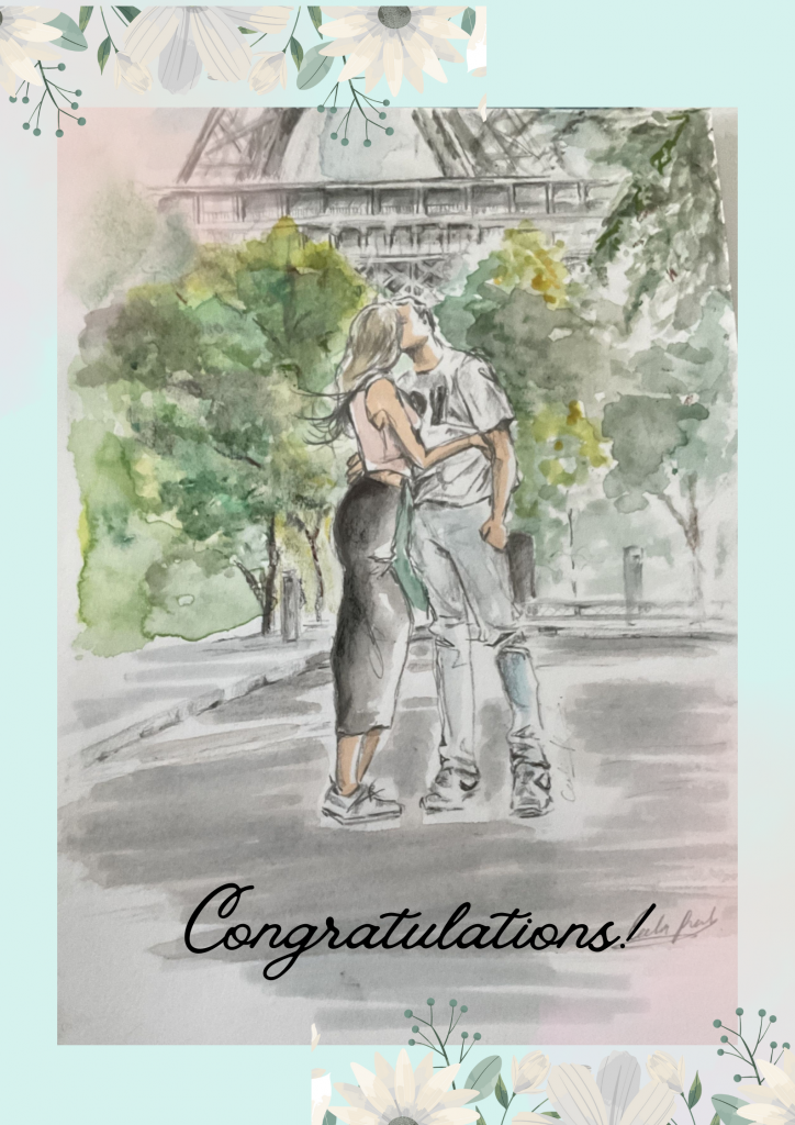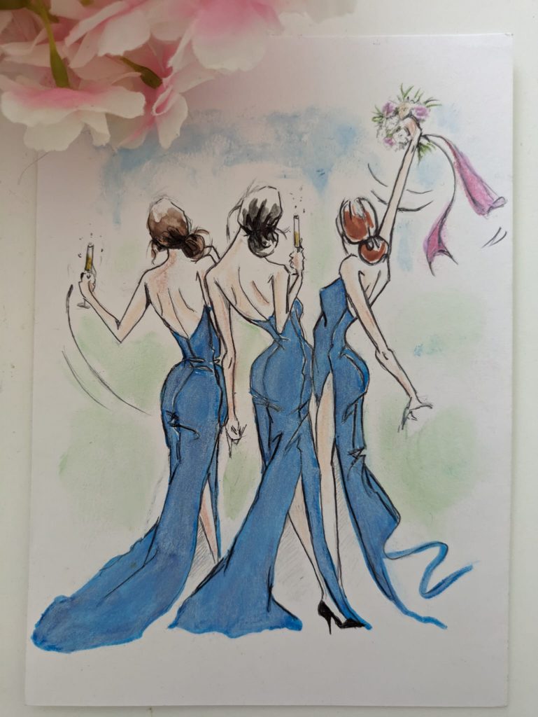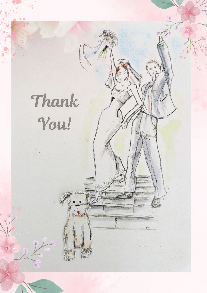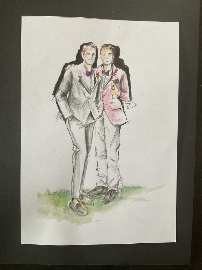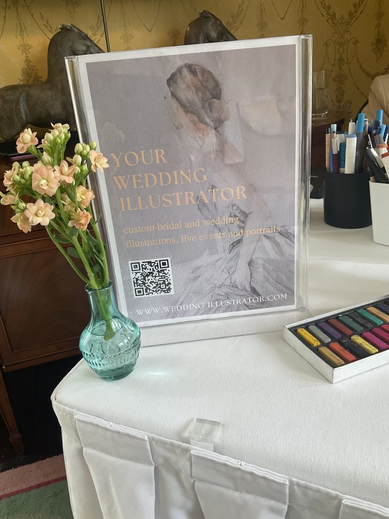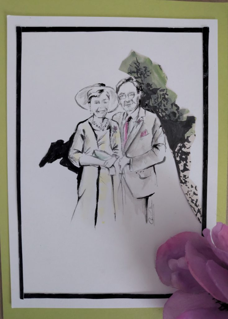 A4 ((8.3″ x 11.7”) fine art bespoke newly weds’ illustration also included, drawn from your photo references (which you can email to me later at your convenience) and I will create in my studio. You can decide on the style you would like from my Style Gallery and once it is completed, it will be sent directly by post for you to look forward to after the event!