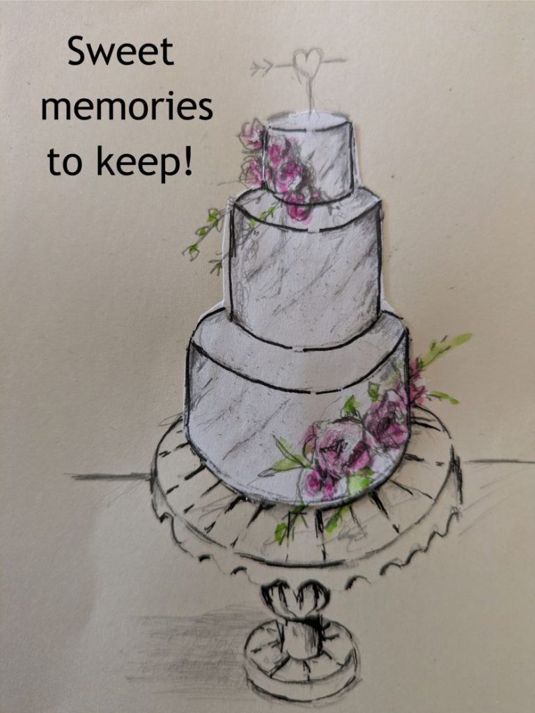 OneComplimentary bespokeA4 fine art portrait of one or both of you as the newly wed couple, wedding cake and bridal bouquet from your photo references, which I complete in my studio and send directly to you.