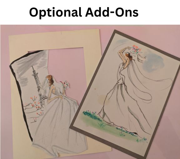 When you book either the Emerald or Diamond package, you can avail of a complimentary A4 fine art bespoke illustration of one or both of you as the newly wed couple, created in my studio from your photo references (which can be sent to me by email). These will be posted directly to you after the event for you to look forward to! For style options click here
