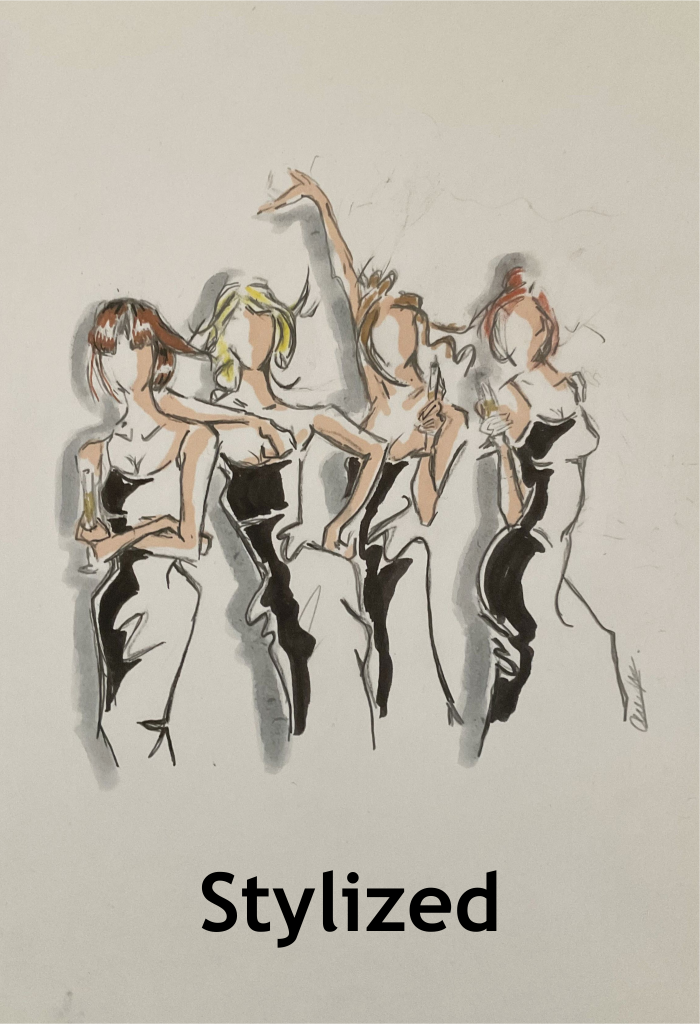 Choose the look that matches your vision, either ‘Stylized‘ or ‘Lifelike‘. Both can be ordered in either colour or monochrome at the time of booking. A5 size (5.8” x 8.3”) artists grade paper is used for all packages.
